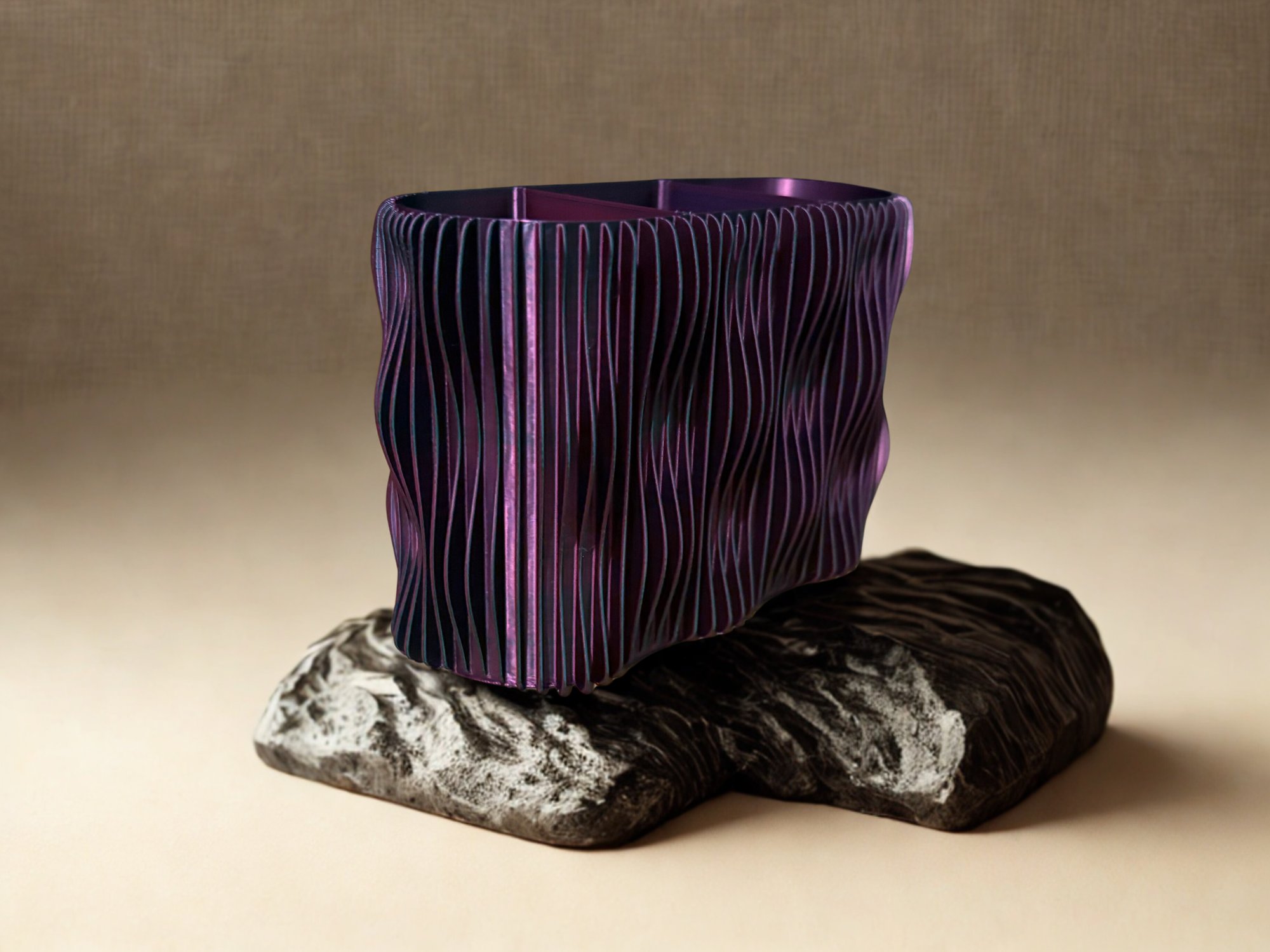 Crafted with a vertical, undulating, wave-like texture, this unique organizer captures attention and adds a modern, architectural flair to any workspace. The material boasts a deep, chameleon-like, iridescent finish, shifting dramatically between vibrant metallic purple, magenta, and a dark, near-black sheen depending on the light and viewing angle. This captivating color play gives it a high-tech, futuristic aesthetic.