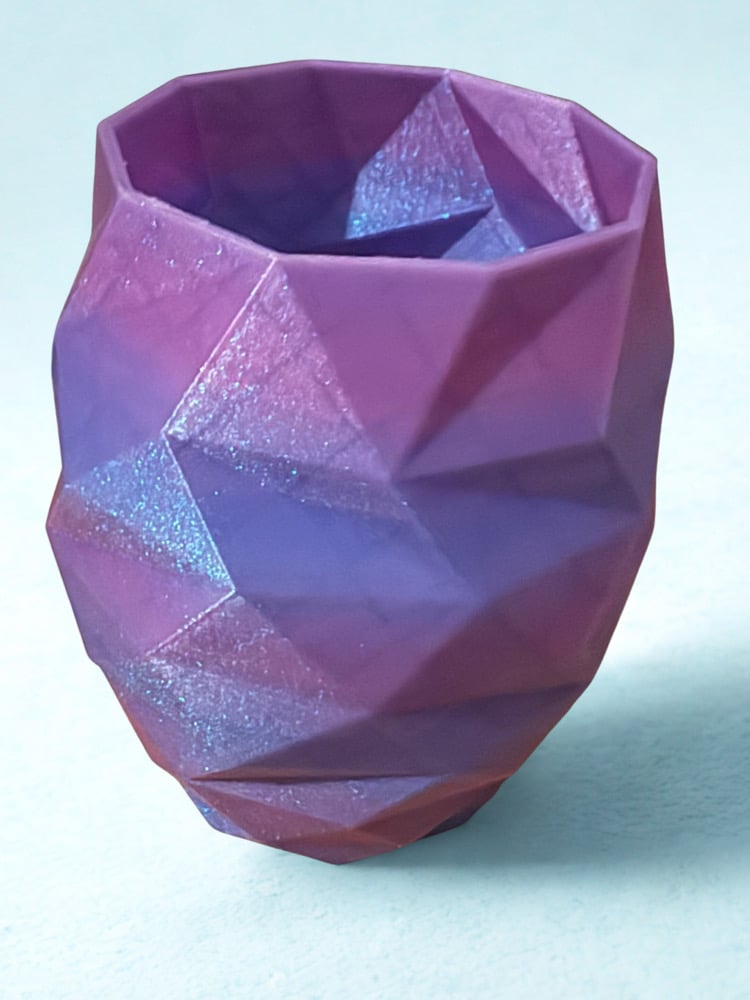 A striking, faceted vessel that seems to capture the quiet intensity of deep space. Its rich amethyst-purple hue is infused with a subtle, iridescent shimmer, causing light to dance across its angular surface like distant starlight. More than just a vase, it is a sculptural statement piece designed to draw the eye and infuse any space with an aura of modern mystery. The perfect home for a simple orchid or a bold, minimalist arrangement.