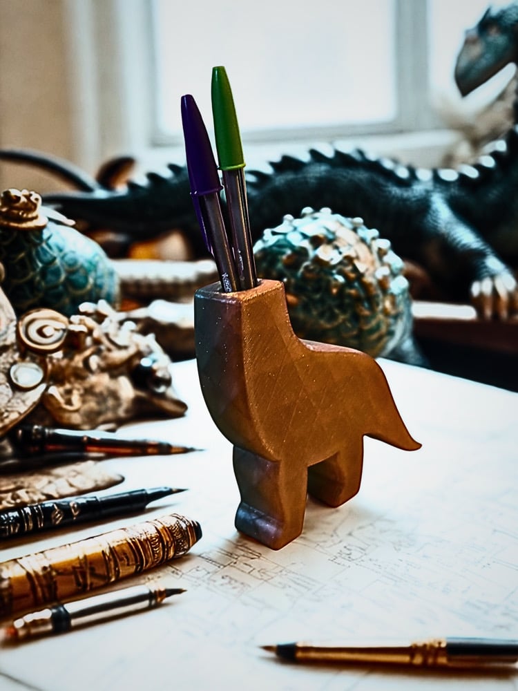 Let this fierce prehistoric beast organize your space. The Pen-saurus is a uniquely styled desktop companion that keeps your pens and pencils neatly contained in its solid body. A cool, blocky design with an ancient bronze look makes it the ultimate conversation piece and a powerful guardian for your favorite writing tools.